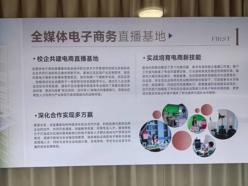全媒体电子商务直播基地是由扬州职业技术大学管理学院联合多家知名企业共同打造的校企融合创新平台。基地立足区域产业发展需求,紧密对接电子商务与新媒体营销前沿,旨在构建一个集教学实践、项目运营、技能培训与社会服务于一体的综合性实践教学中心。通过引入企业真实项目与市场资源,基地不仅为管理学院相关专业提供了高度仿真的实战环境,更成为探索“校企协同、合作育人”新模式的重要窗口,是推动应用型人才培养与产业转型升级深度融合的战略举措。